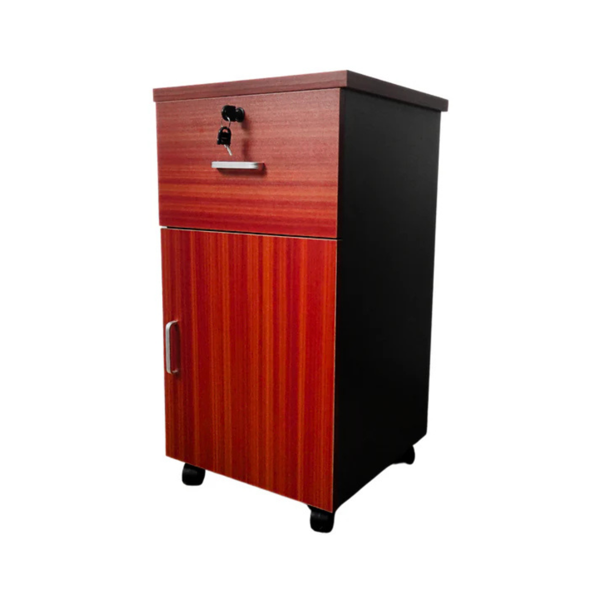 Esta cajonera alta es perfecta para organizar documentos y artículos de oficina. Con dimensiones compactas (38 cm de ancho, 40 cm de profundidad y 75 cm de altura), ofrece movilidad y versatilidad. Tiene 1 cajón, el primer cajón con llave, y una puerta abatible para organizar materiales. Fabricada en tablero laminado de melamina, es resistente al agua, suciedad y rayones, asegurando durabilidad. La cubierta superior tiene un grosor de 24 mm, y los laterales de 15 mm, brindando estabilidad y un acabado robusto.
