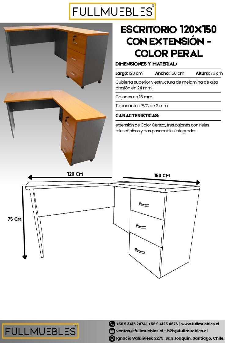 Escritorio 120x150 Con Extensión - Color Peral