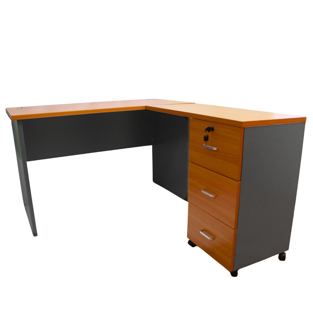 Este escritorio en forma de L ofrece una superficie amplia y cómoda para organizar tus tareas diarias, ya sea en oficina o home office. Su diseño permite aprovechar rincones y separar áreas de trabajo, facilitando la concentración y el orden. Los cajones integrados brindan almacenamiento accesible para documentos, herramientas o accesorios, mientras que la extensión lateral es perfecta para colocar impresoras, monitores adicionales o elementos decorativos. Ideal para quienes buscan eficiencia sin sacrificar estética.