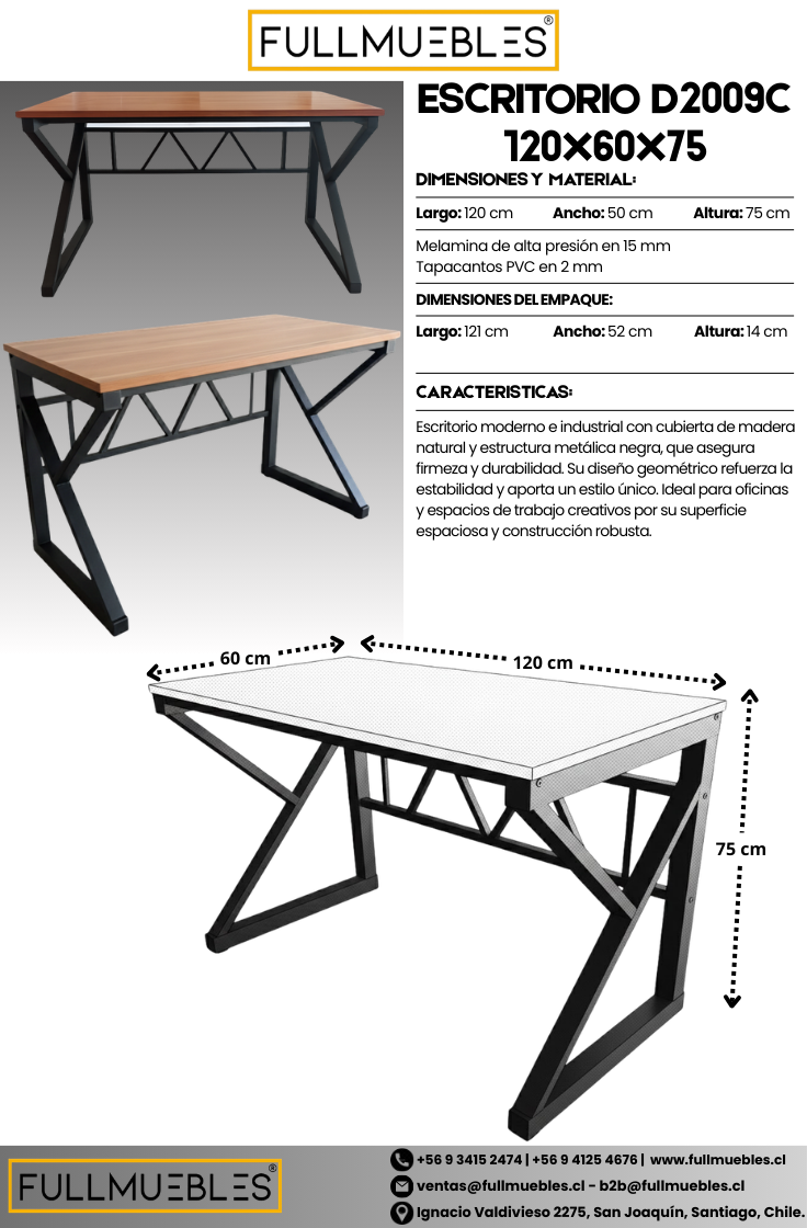 Escritorio de estilo moderno e industrial, con cubierta en madera natural y estructura metálica negra. Su diseño geométrico reforzado aporta estabilidad, personalidad y un estilo único. Ideal para oficinas, estudios o espacios de trabajo creativo gracias a su superficie espaciosa y construcción robusta.
